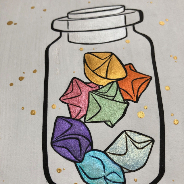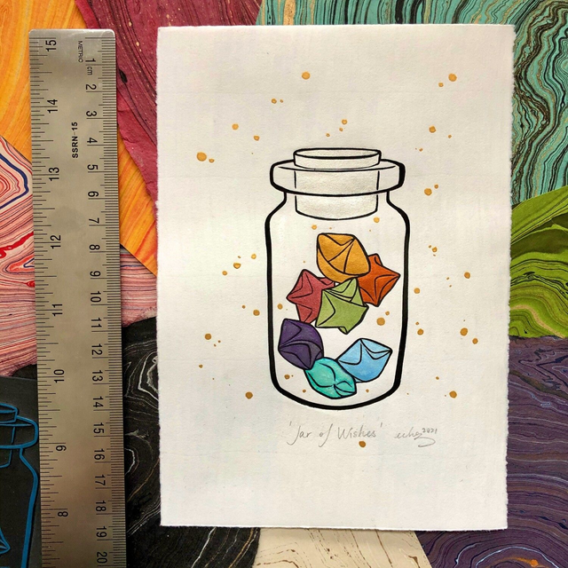Linocut print on Zerkall 120 gsm printmaking paper, Caligo Safe Wash Relief Ink, Finetec, Kuretake and Boku-undo metallic and pearlescent paints (all materials archival)