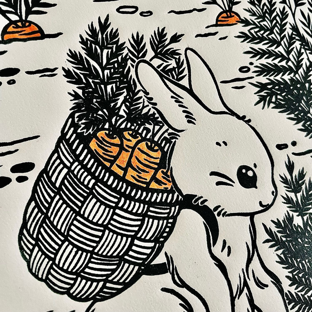 Gomuban (Japanese vinyl) linocut print, Shown in the 2023 Correspondances Gravées Print Exchange and exhibition, Manosque, France, and its traveling counterpart in 2024 in Quéven, France.