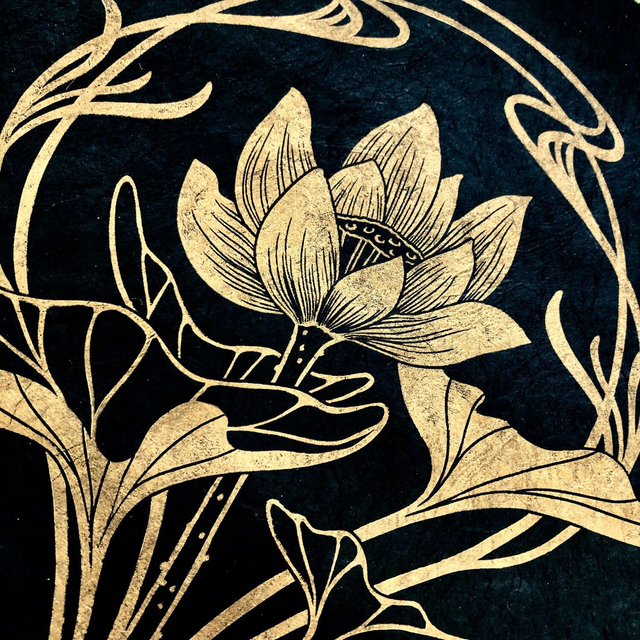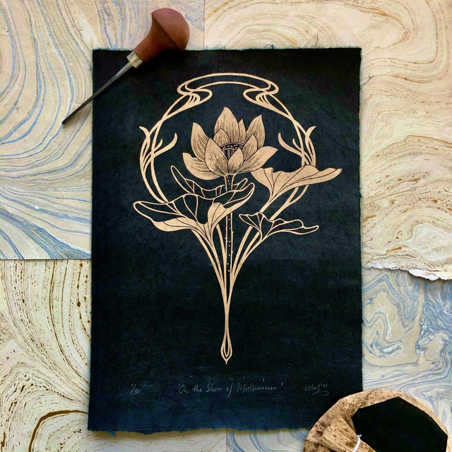 Linogravure sur papier lokta népalais, encre lettrepress Ink in Tubes, papier et encre de qualité archivale